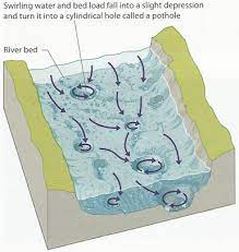 Definition : In the process of friction, the rocks carried along the current of the river form small, almost round holes in the river bed. These are called pot holes. For example, there are numerous mouth wells in the river basins of the rivers flowing in the hilly areas of the himalaya